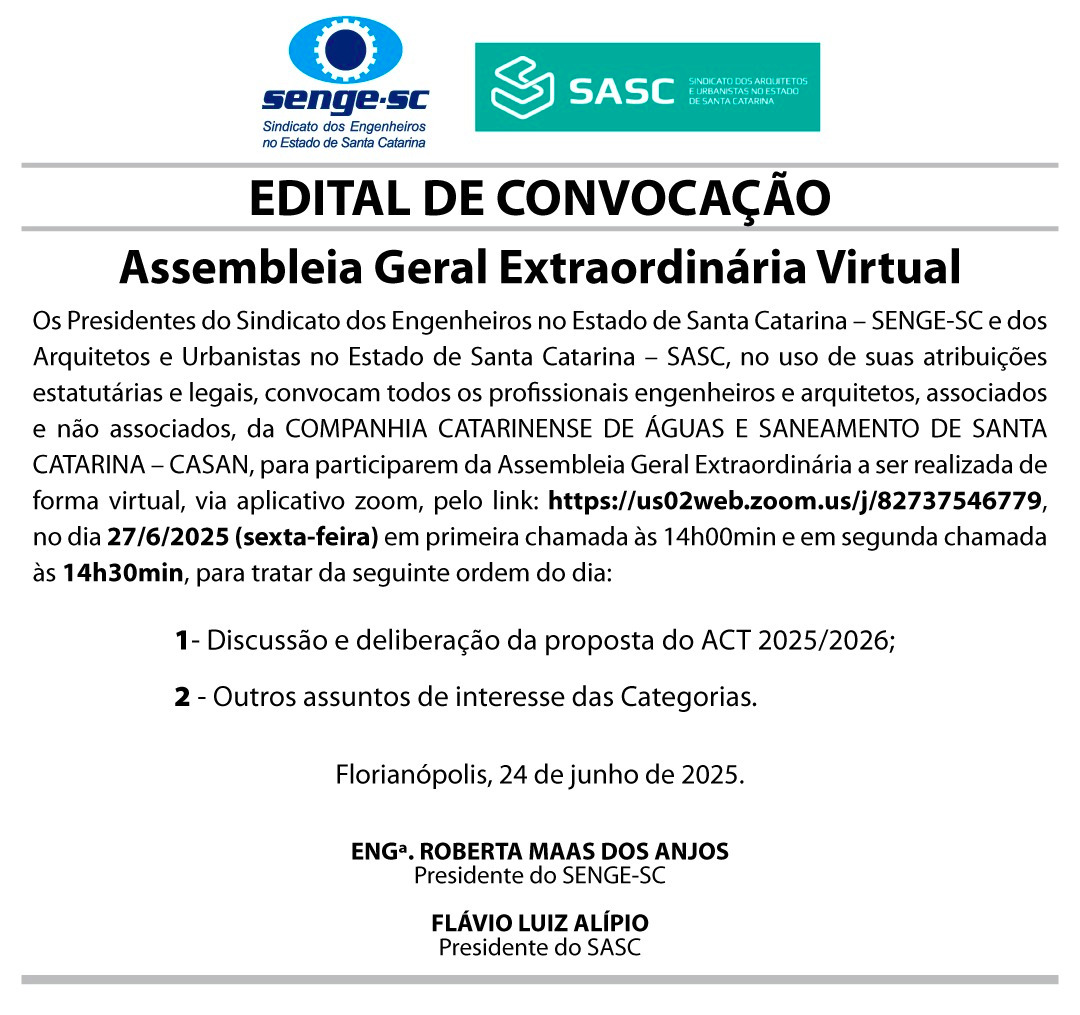 Com o objetivo de discutir e deliberar a proposta do ACT 2025/2026 e tratar demais assuntos de interesse das categorias, os presidentes do Sindicato dos Engenheiros no Estado de Santa Catarina (SENGE/SC) e dos Arquitetos e Urbanistas no Estado de Santa Catarina (SASC), convocam todos os profissionais de engenharia e de arquitetura e urbanismo, para participarem da Assembleia Geral Extraordinária.